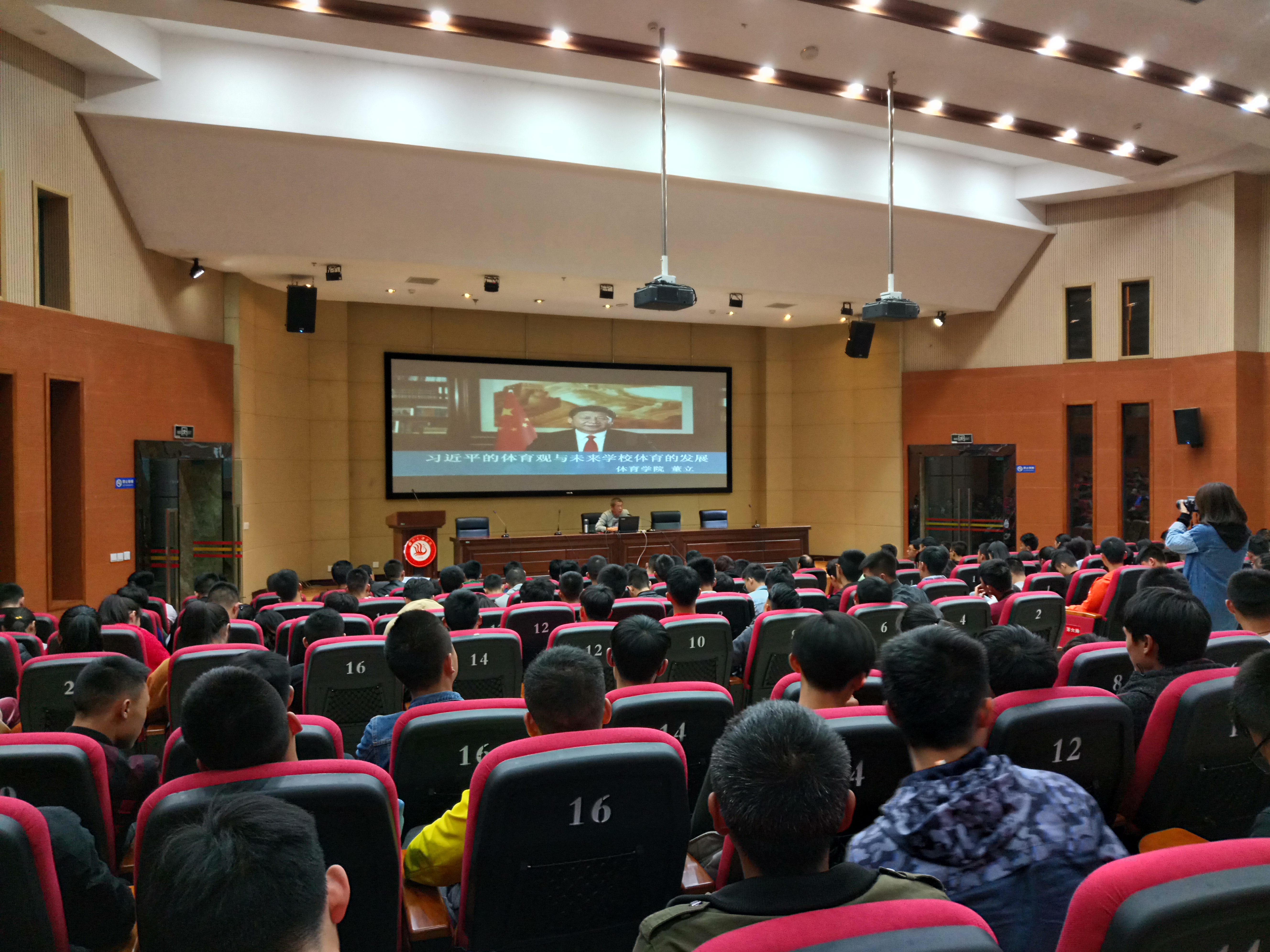 董立教授围绕“习近平的体育观与未来学校体育的发展”这一主题,通过五点详细解读了习近平同志的体育观与体育实践。首先他逐句解读了习近平同志在“党的十九大报告”中对体育的论述。“广泛开展全民健身活动”:“运动”与“活动”虽然只是一词之差,却反映出体育在中国特色社会主义进入新时代后的新使命。习近平同志将全民健身与全民健康、全面小康高度关联,体现了中国共产党人为中国人民谋幸福,为中华民族谋复兴的初心和使命。“加快推进体育强国建设”:这是有史以来党代会报告中第一次提出“体育强国建设”。“筹办好北京冬奥会、冬残奥会”:相隔10年时间,党代会报告再次提及筹办好大型赛事,反映出体育在中国特色社会主义进入新时代后的新功能。接着,董立教授结合习近平5年来对体育的主要论述、重视足球发展和习近平的体育实践,详细分析了习近平的体育观。第三,董立教授介绍了习近平善于运用体育运动智慧指导日常工作和外交活动。接下来,董立教授分析了中国学校体育现状。最后,董立教授指出“在人工智能、大数据时代,体育仍然是不可替代的”,勉励在座师生“学好体育,享用终身”,以身作则,转变学校体育观念,让学校体育育人的各项功能充分显现,从以前以增强学生体质的单一教学,变为全方位育人的手段。学生通过运动竞赛、运动训练,培养吃苦耐劳的精神、集体主义精神和协同配合的精神。