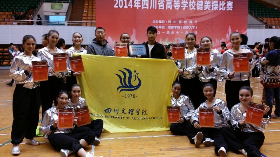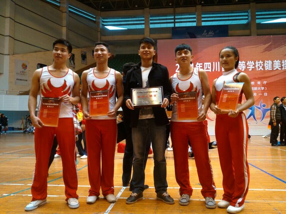 由四川省教育厅主办的“2014年四川省高等学校健美操比赛于10月31日至11月2日在成都大学隆重举行。是四川省高校健美操最高水平比赛全省共有19所高校近300名运动员参赛。我校两支参赛队伍在佘涛书记,教练员唐绪明老师和刘伟同学的带领下努力拼搏,不负望,自由舞蹈、大众健美操规定套路五级两个比赛项目中都取得第一名的好成绩,同时还荣获大赛精神文明奖。