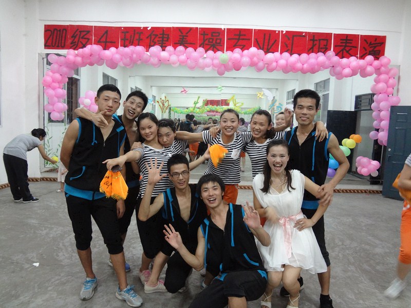 6月21日晚,2010级4班在莲湖校区健美操房举办了健美操汇报表演。本次晚会由冉卫东老师和彭先琴同学主持,李霞、那明明辅导员老以及2012级全体健美操专业同学观看了演出。