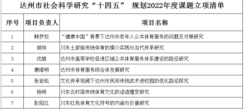 近日,达州市社科联发布了达州市社会科学研究“十四五”规划2022年度课题立项通报,据统计,万象城娱乐awc线路教师共立项课题7项。具体立项名单请参见下表。请各位立项项目负责人认真做好项目研究工作,确保立项按时保质完成。