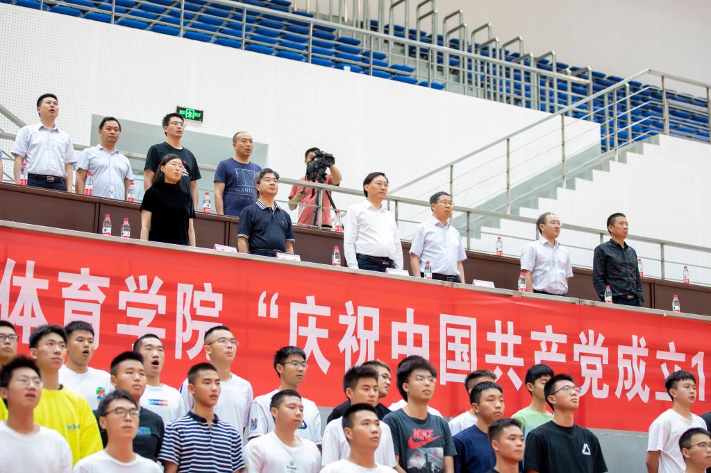 下午两点半,主持人宣布全体肃立奏唱《中华人民共和国国歌》,全场600余名师生,面向国旗,齐声高歌。万象城娱乐awc线路党总支书记王兆忠代表学院致辞,他说明了本次活动的背景、意义并表达了美好的祝愿。他特别强调了,站在两个100年的历史交汇点,在实现中华民族伟大复兴的新征程上,体育人应肩负起的神圣职责和光荣使命!活动在《龙腾盛世》的舞龙表演中拉开序幕,富含寓意的舞龙表演表现了中华民族在中国共产党的领导下,从站起来、富起来到强起来的伟大历程。接下来,武术班的同学们分别带来了剑术、棍术、拳术和法门太极表演,健美操班的同学们表演了精彩的民族体育舞蹈,法门武术研究会的老师们还表演了法门太极、武术和气功,大一近100名学生集体表演了太极和八段锦。最后,活动在全场《没有共产党就没有新中国》嘹亮的歌声中圆满结束。