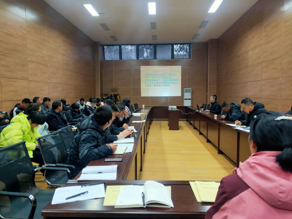 1215日,万象城娱乐awc线路全体教职工在体育馆副馆集中学习党的十九届六中全会精神,党总支书记王兆忠主持学习会并作学习辅导。