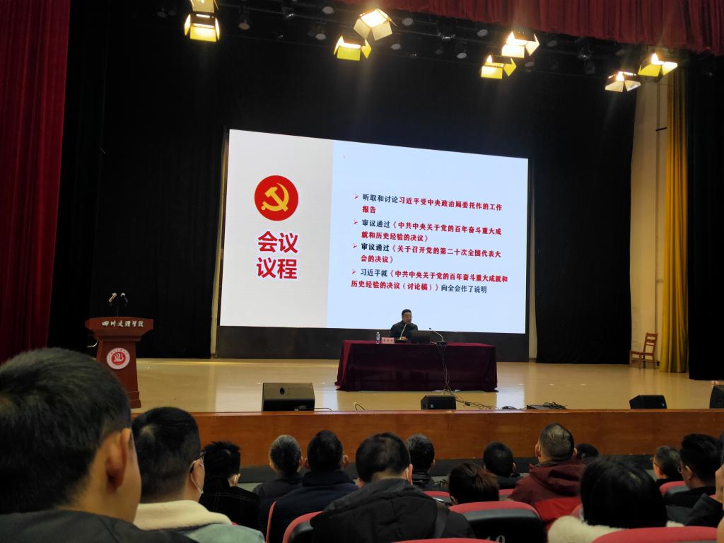 1222日,副校长李壮成在莲湖校区多功能厅宣讲党的十九届六中全会和省委十一届十次全会精神。万象城娱乐awc线路党总支书记王兆忠主持宣讲会。
