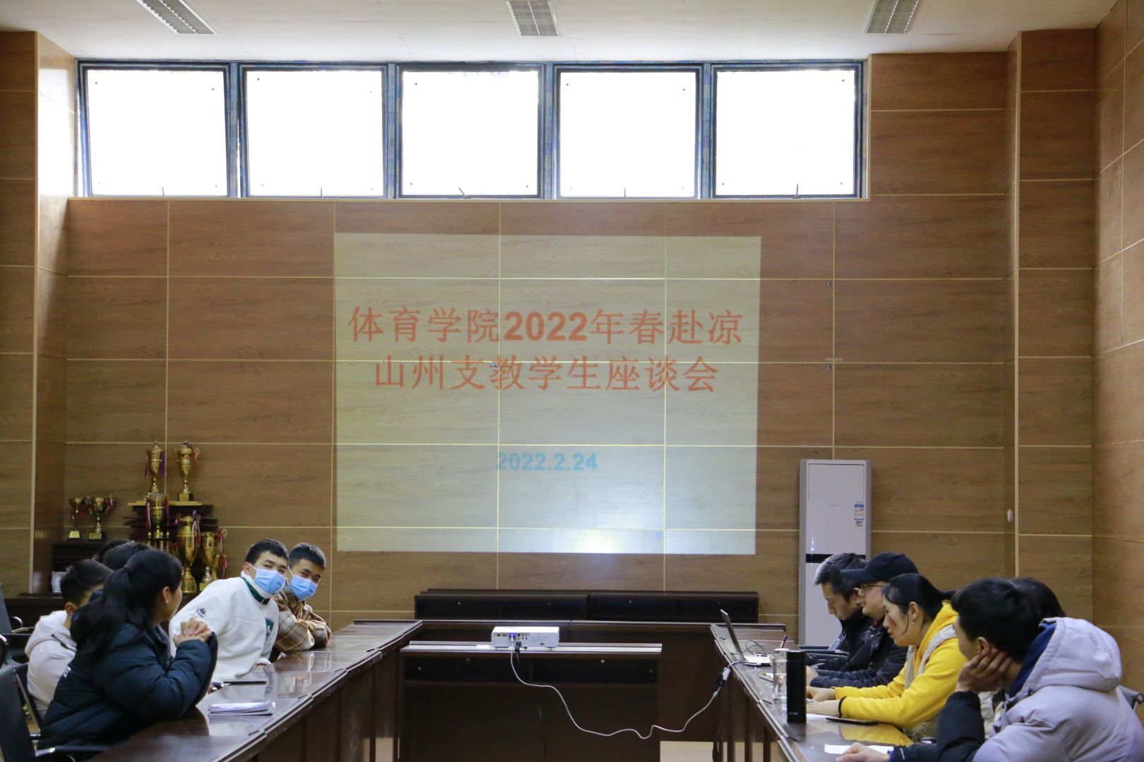 2022224日下午,万象城娱乐awc线路在体育馆附馆105召开了2022年春赴凉山州支教学生座谈会。万象城娱乐awc线路党总支书记王兆忠,院长佘涛,党总支副书记彭波,团总支书记祝利平,部分专兼职辅导员以及支教学生参加了本次座谈会。会议由辅导员闫青主持。