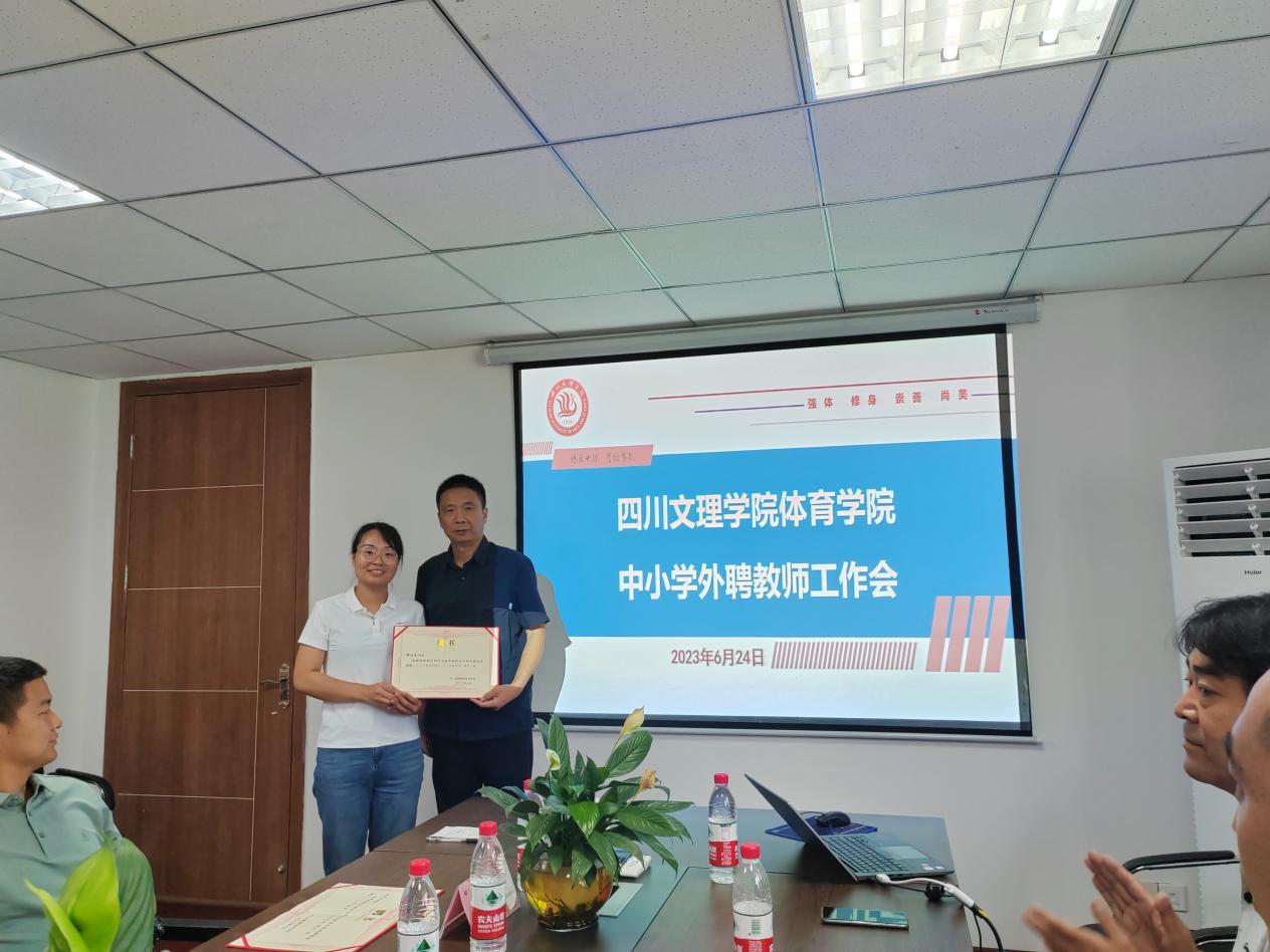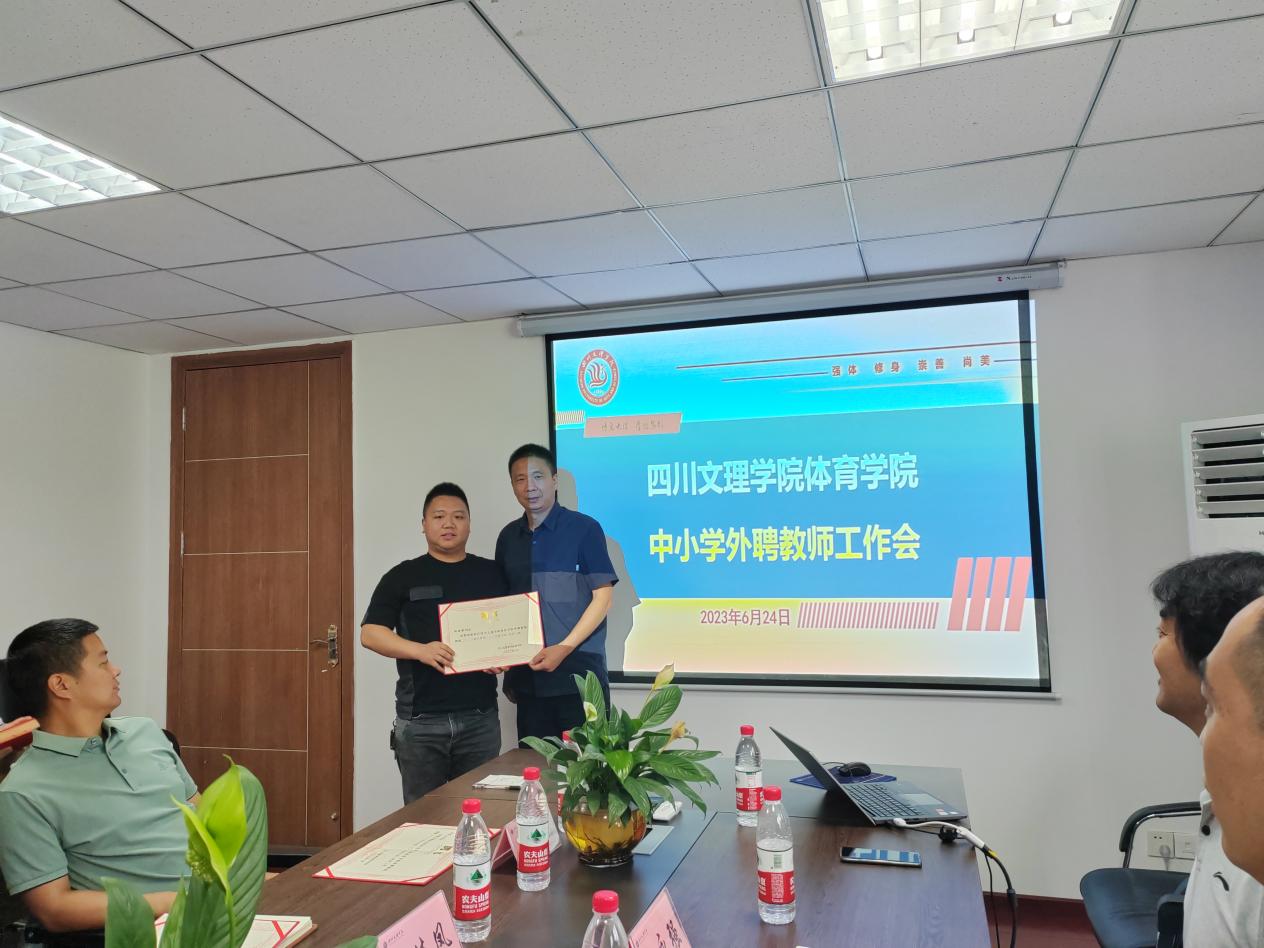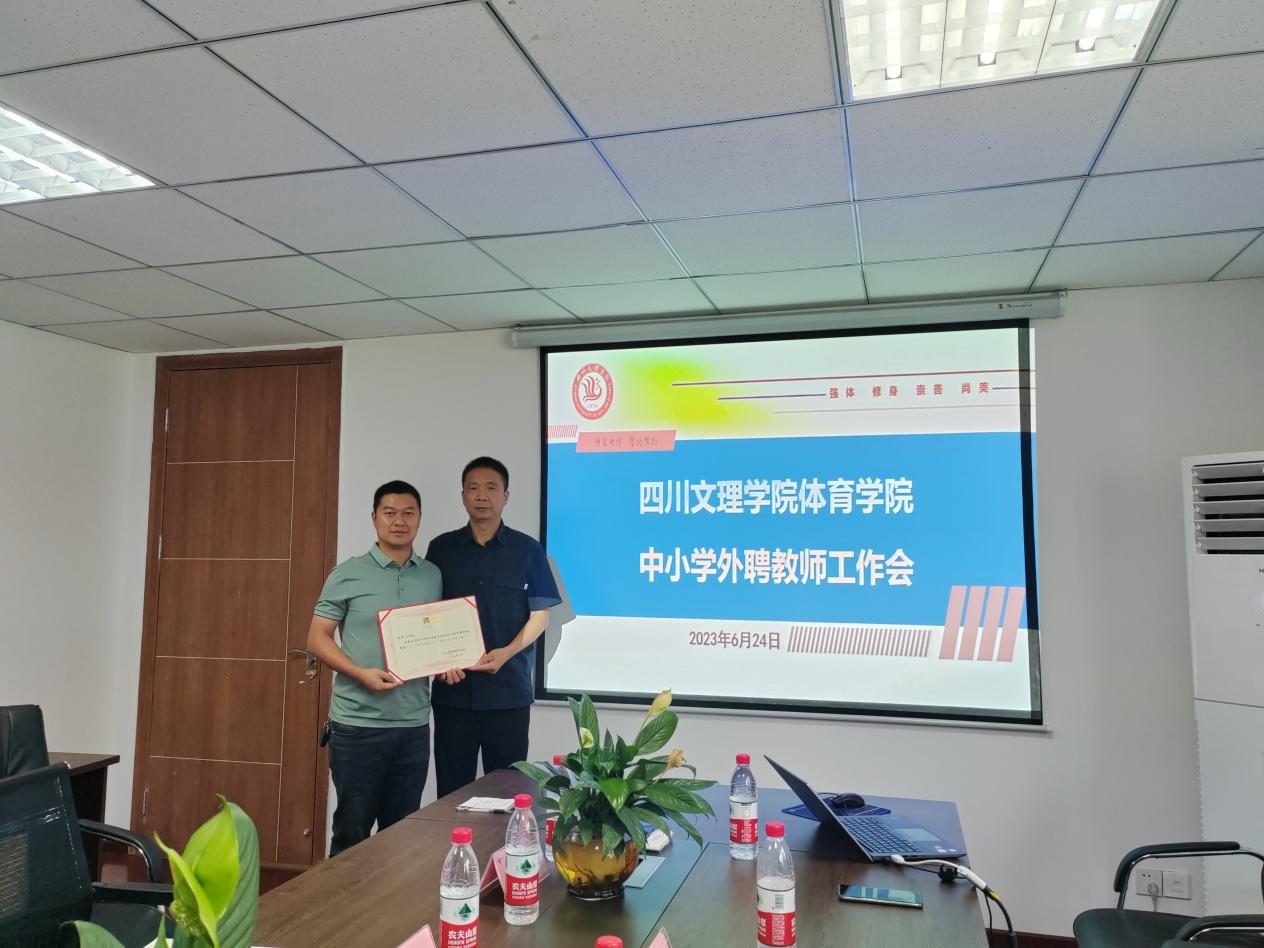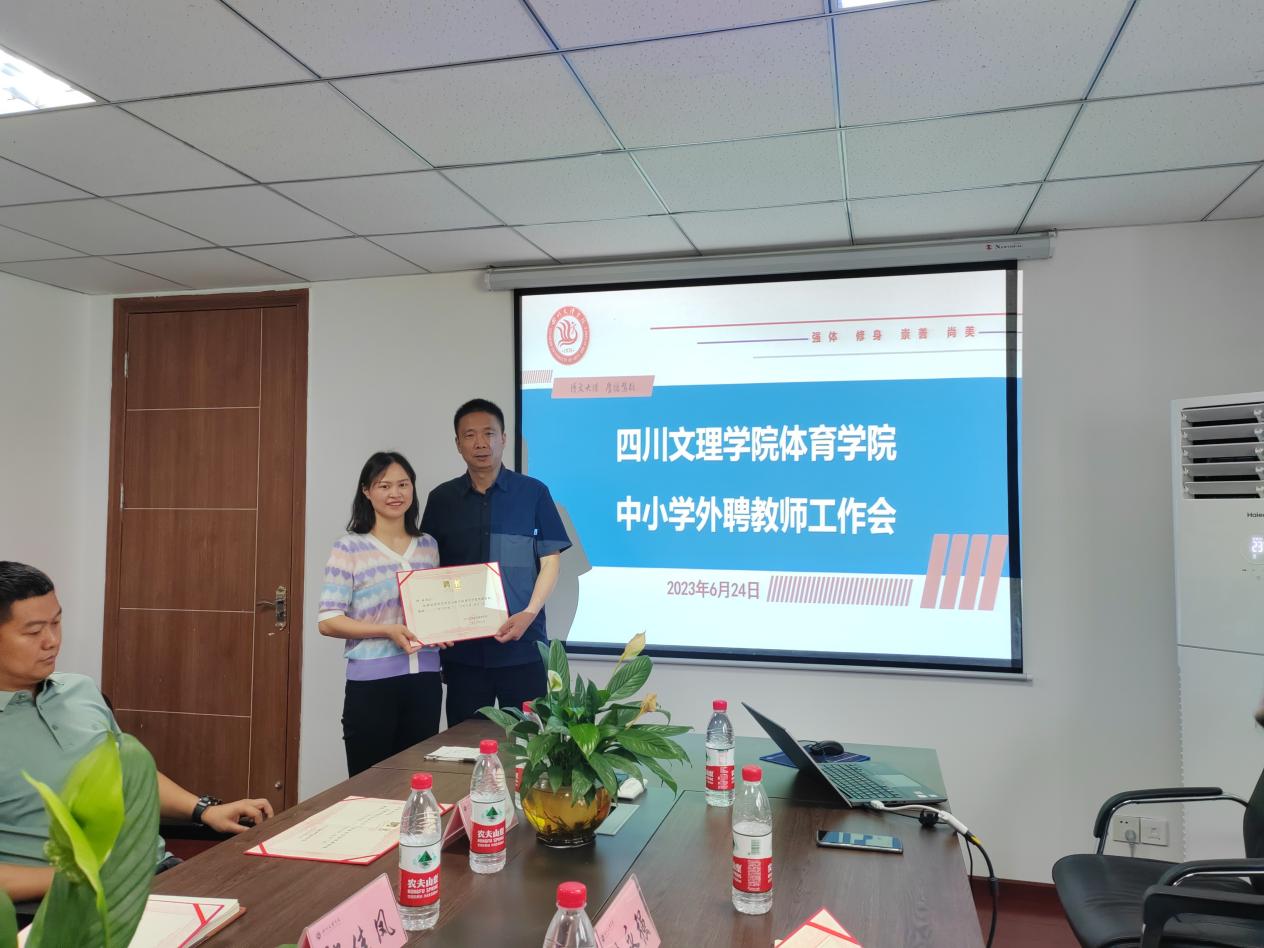 佘涛院长对万象城娱乐awc线路的办学历程及基本情况进行了简要介绍,并代表学院感谢大家在学院发展中给予的大力支持。他汇报了学院体育教育专业认证工作的推动情况。他指出,师范专业人才培养质量评价的重要依据是师范生和用人单位的满意度,为对接社会需求,提升人才培养质量,学院特聘部分中小学优秀体育教师和专家作为学院体育教育专业的外聘教师。随后,院长佘涛、副院长孙亮亮为向珏璞、冉香山、杨曲、郎佳凤四位中小学优秀教师颁发了聘书。并围绕中小学体育教育课程标准、体育教育人才需求、中小学体育教育现状及困惑,与会老师进行了深入的交流。
