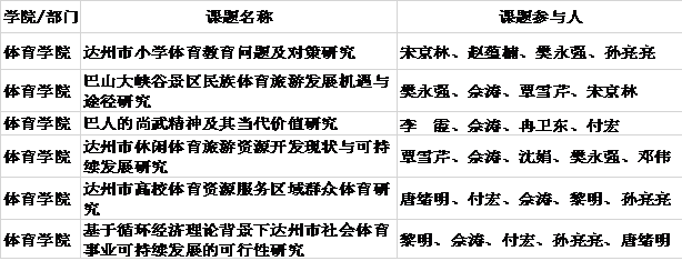 2020421日,达州市社科联办公室下发文件《达州市社会科学研究十三五规划2020年度课题立项通报》(达市社科〔20209号)。据悉,我院各科研团队荣获6项课题立项。