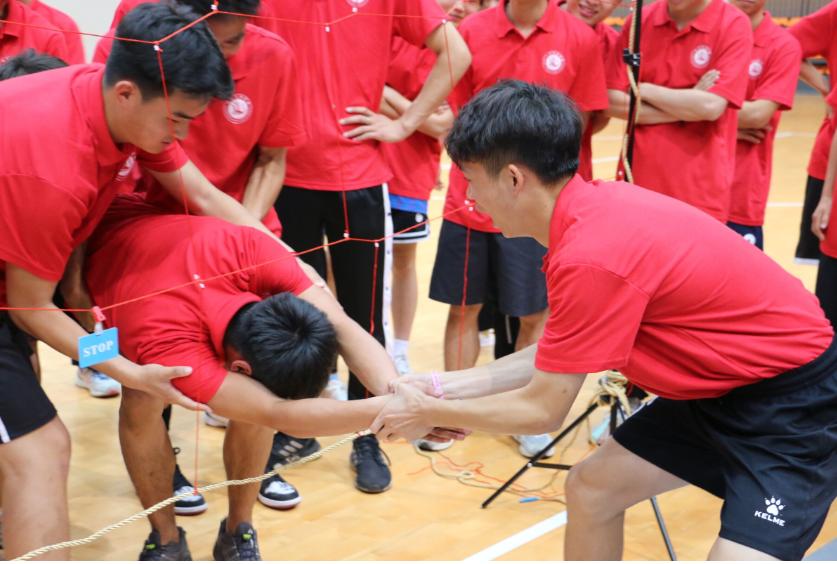 通过趣味项目进行了热身后,宋老师组织同学们开始穿越电网项目训练。活动中,同学们从最开始的手忙脚乱、不知所措、需要帮助到选出队长、在队长指挥下团结协作、有序实施每一步行动。随着难度的不断增加,部分同学出现失误,导致队长不断接受惩罚,同学们开始意识到自己的失误不仅连累了队长,还影响了整个团队。随即有队员陪同队长一起受罚,到最后所有同学一起陪同队长受罚。在项目体验过程中,同学们深刻认识到必须摆正自己的位置,做好自己本职工作,不给团队添麻烦,高度协作,才能共同实现目标。大约一个小时,在同学们的共同努力下,最终完成既定目标,发出愉快的欢呼声。